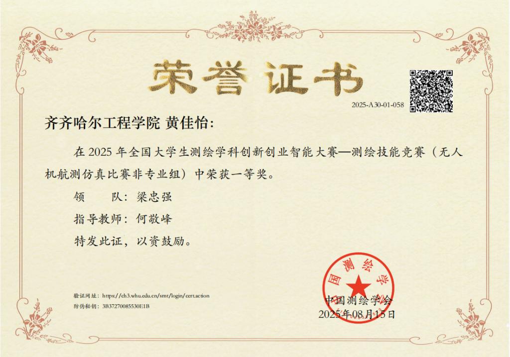 近日,由中国测绘学会教育工作委员会主办,内蒙古科技大学承办的“2025年全国大学生测绘学科创新创业智能大赛”圆满结束,Beat365土木与管理学院智能建造241班学生黄佳怡,在虚拟仿真数字测图1720组非专业组中脱颖而出,获得“无人机航测仿真比赛”赛项一等奖。“全国大学生测绘学科创新创业智能大赛”于2023年入选《全国普通高校大学生竞赛分析报告》竞赛目录,成为测绘科技创新的最高级别赛事。其目的是更好地发挥测绘学科特色与...