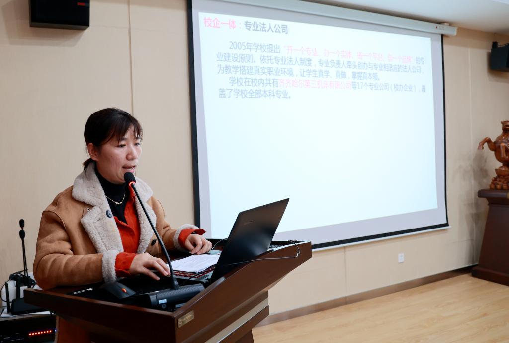王丹作《课程建设与教学改革》汇报,从学校的发展历程、课程建设以及学习产出标准和评估认证标准等方面进行了说明,并对校企合作、专业实践学期进行了重点说明。