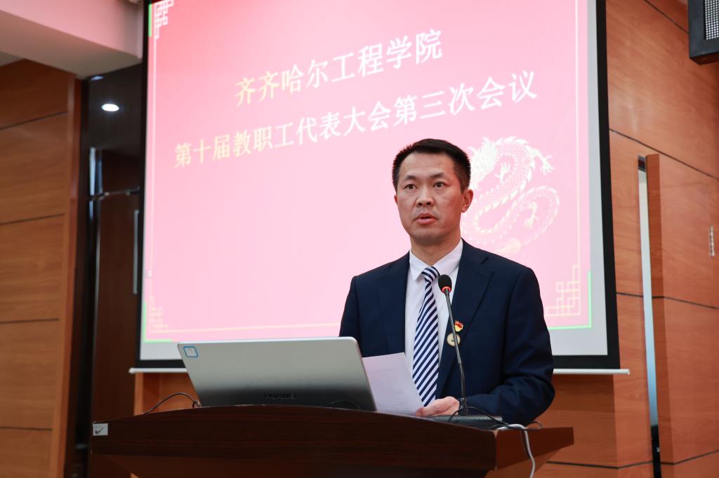 党委书记郭伟东致大会闭幕词。他指出,工作报告全面总结了学校2023年发展情况,提出了2024年的主要工作和奋斗目标,凸显了改革的主题、发展的思路。他强调,教职工代表们履职尽责,对学校一年来的工作以及下一步的改革和发展提出了许多宝贵的意见和建议,充分体现了广大教职工的主人翁精神和高度责任感。他指出,2024年是学校迎接审核评估关键之年。全体教职工要抢抓大有可为的发展机遇,共同谱写学校高质量发展新篇章,实现本科教育教学审核评估华丽通过的宏伟目标,在创建百年老校的征程中留下浓墨重彩的一笔。