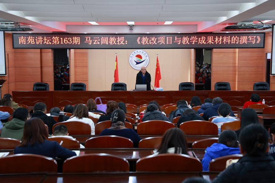 下午,南苑讲坛第163期在图书馆601报告厅举行,马云阔教授应邀作“教改项目与教学成果材料的撰写”专题报告,学校领导、各教学单位负责人及骨干教师200余人参会。