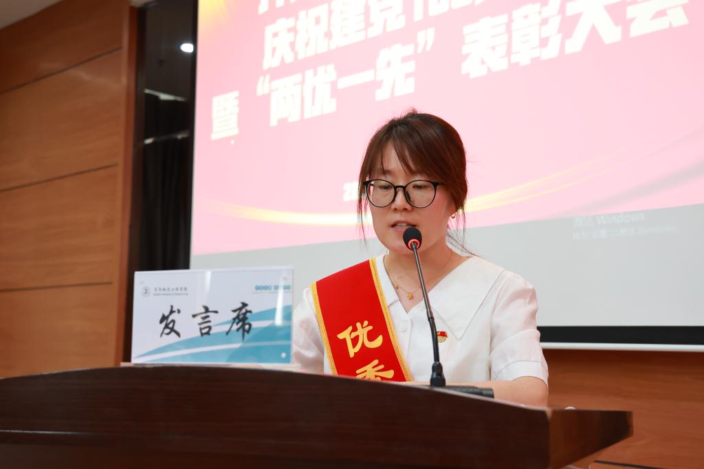 机电工程系邓敏同志代表受表彰集体和个人发言。她表示,将倍加珍惜荣誉,不忘初心,牢记使命,充分发挥共产党员的先锋模范作用,开拓创新,扎实工作,为学校各项事业的发展添砖加瓦,为鲜红的党旗增光添彩。