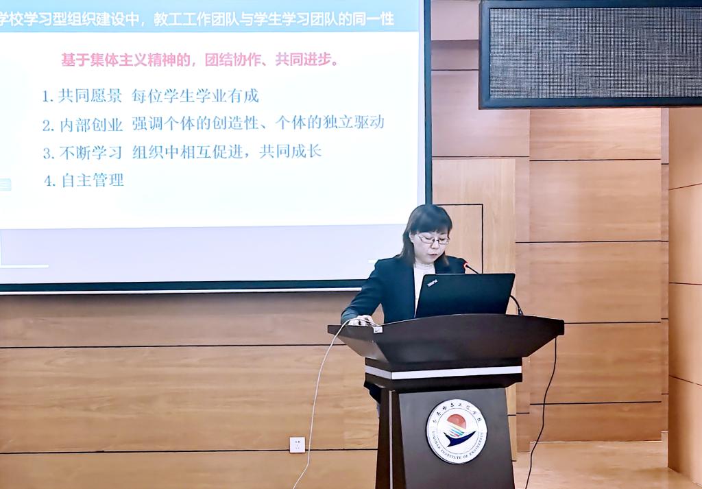 汇报中,学校相关部门共分为五组,采用双抽的方式,现场抽签确定汇报顺序和汇报人。汇报人代表所在组,结合工作实际,从教育家精神和自律、他律角度分析在学校学习型组织建设中,教工工作团队与学生学习团队的同一性和差异性,并总结为两个团队的同一性都是基于集体主义精神的团结协作、共同进步。