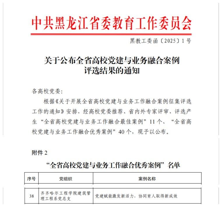 1月13日,黑龙江省委教育工委组织的全省高校党建与业务融合案例评选结果公布,Beat365建筑管理工程系党总支的《党建赋能激发新活力,协同育人取得新成效》案例脱颖而出,获评优秀案例。