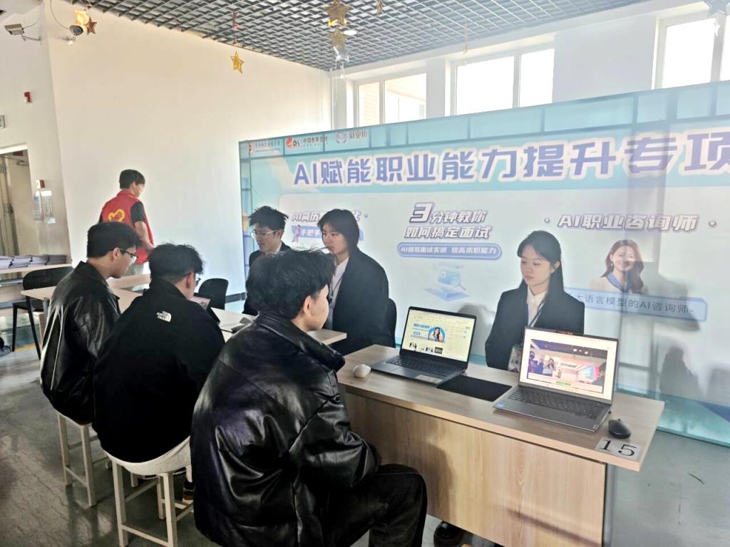 本次招聘会呈现三大亮点:一是会场特设的“就业直播间”,部分企业走进直播间,在线介绍企业情况及用工需求,吸引了数万名线上观众观看,实现了线上线下联动,拓宽了招聘渠道;二是学生发展中心在现场设立了“就业咨询”台,为毕业生提供全方位的就业指导服务,包括就业手续办理流程、就业推荐表及三方协议填报等服务;三是设立了“AI赋能职业能力提升”专区,利用先进的AI技术,为毕业生提供简历智写优化、AI模拟面试实训、AI职业咨询师及AI智绘照等服务,增强学生在求职道路上的自信。
