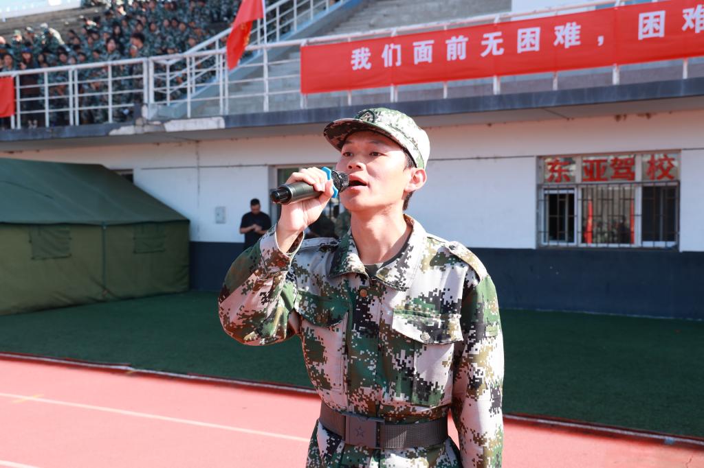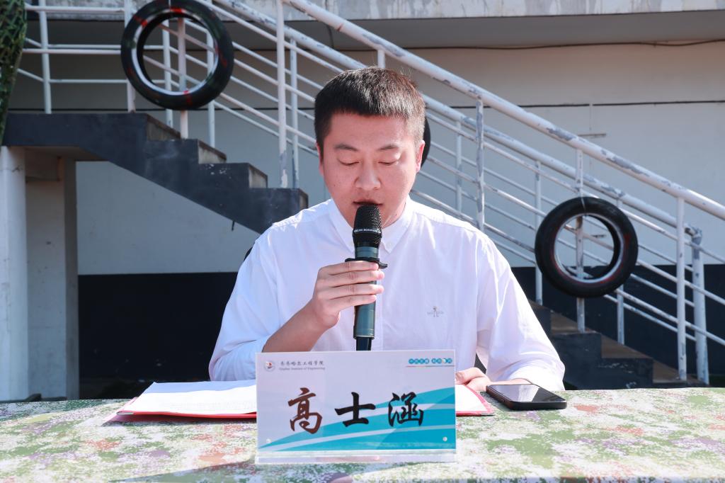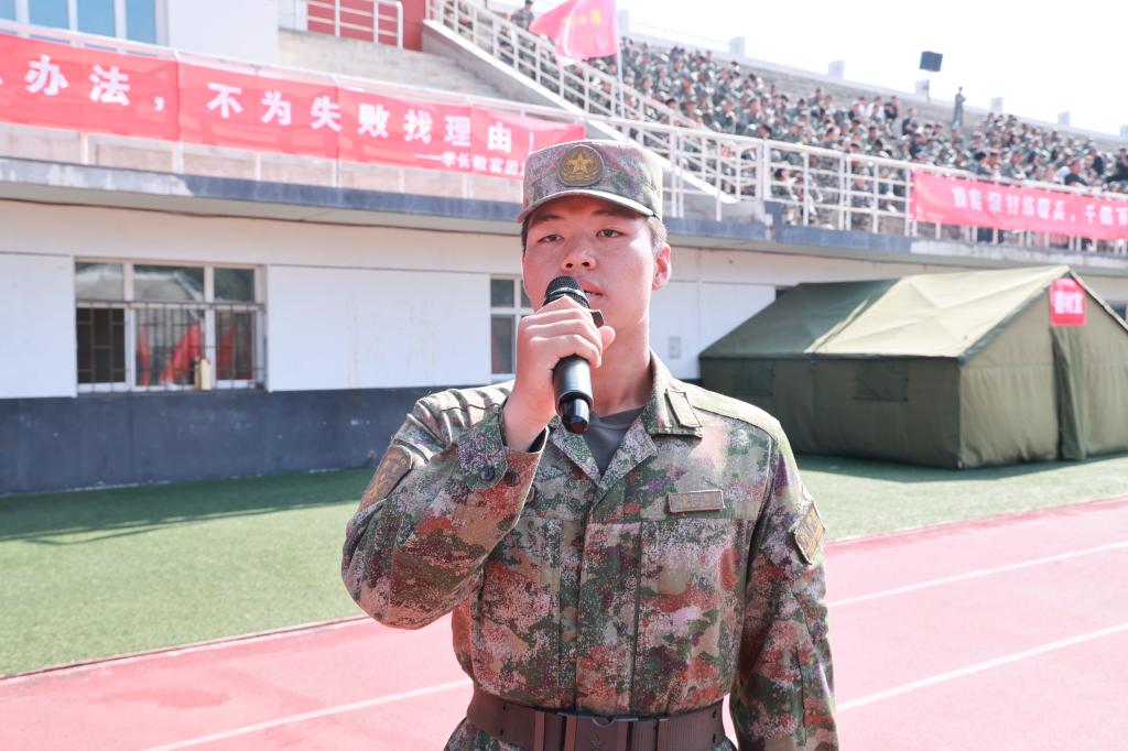 新生代表张广超上台分享军训感悟。他回顾了十余天训练中的训练成果与收获,由衷感谢教官的严格指导和老师的悉心关怀,并郑重承诺,要将军训中锤炼出的纪律意识和坚韧品格融入未来的学习和生活,以更昂扬的姿态开启人生新征程。