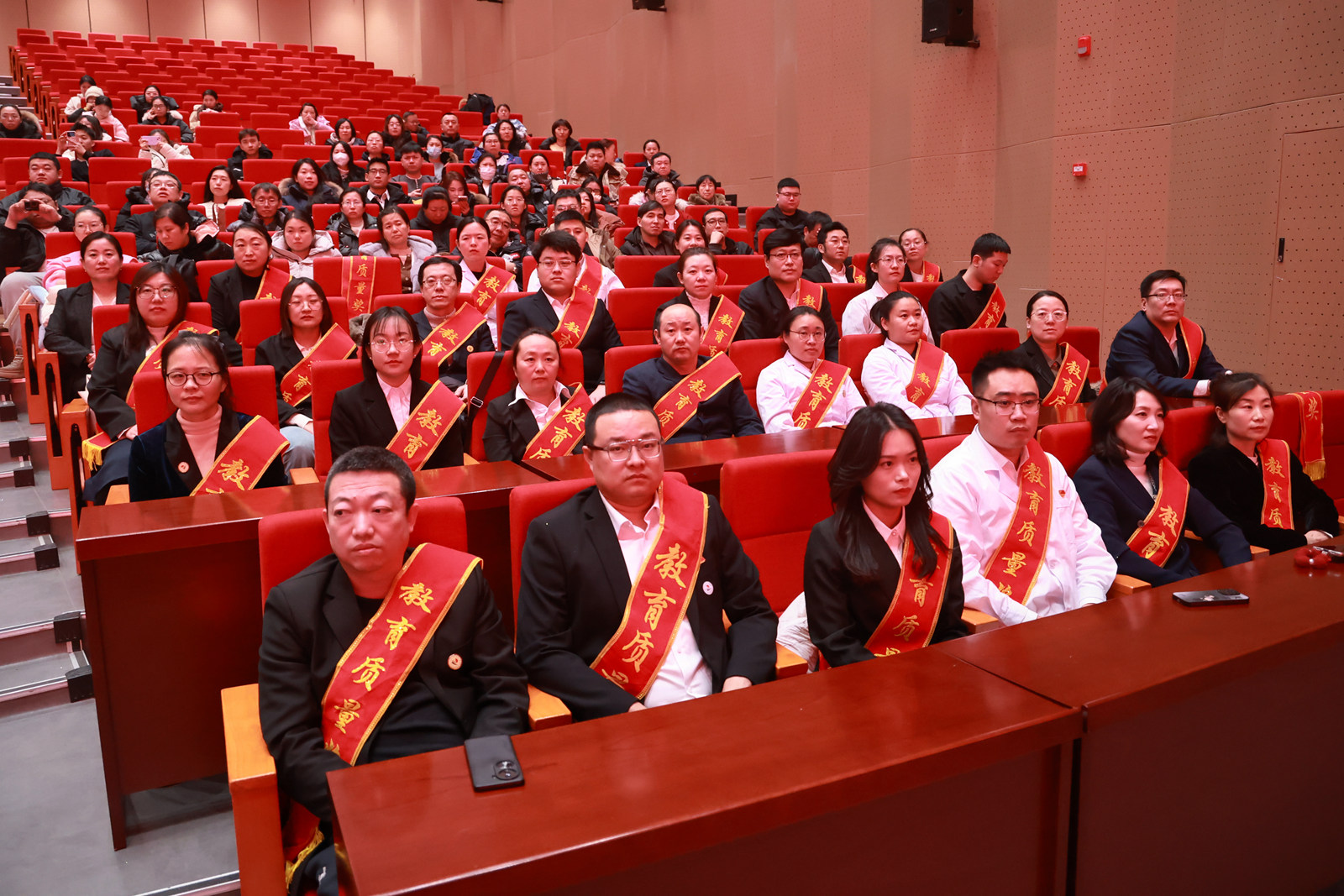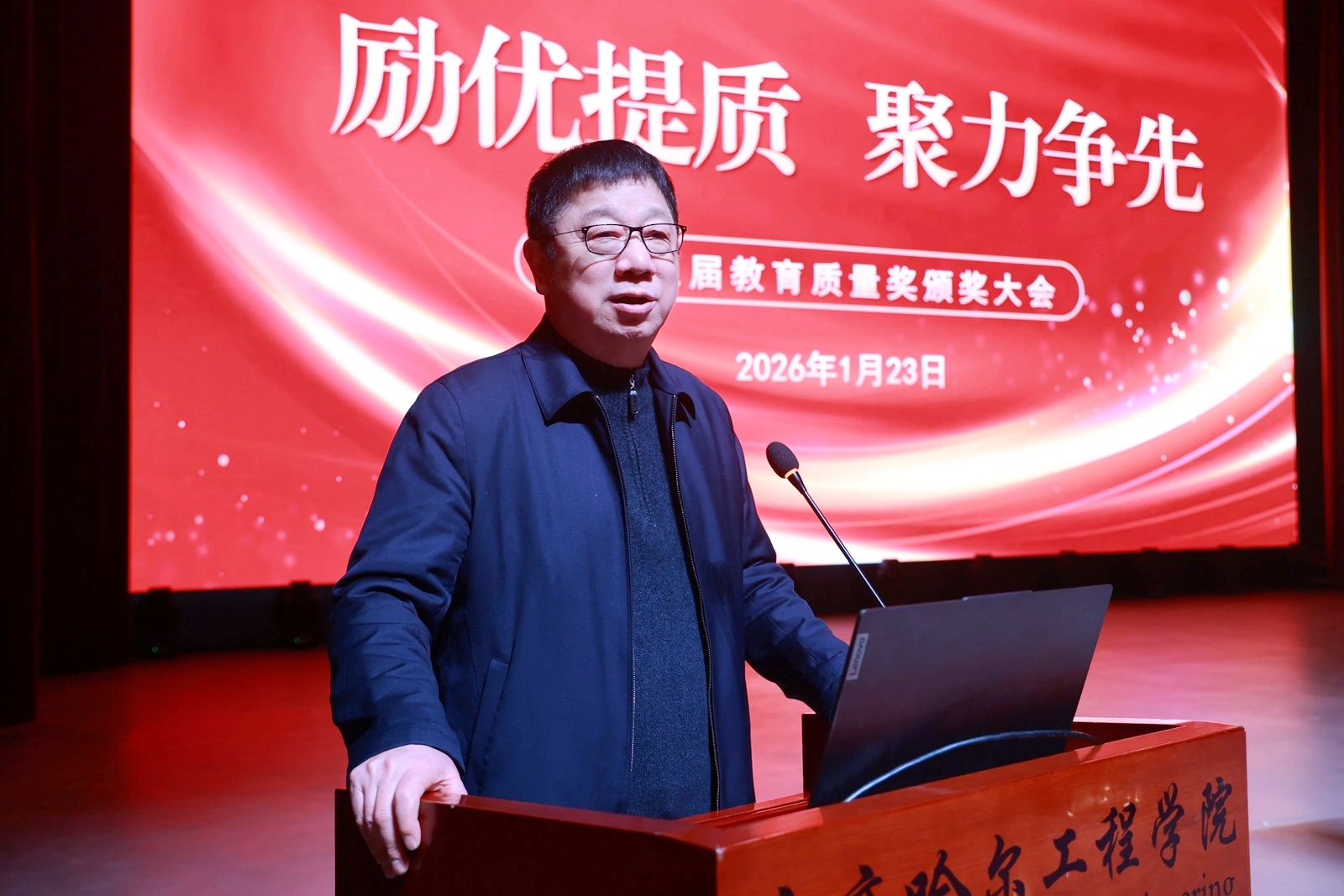 为深入贯彻党的教育方针,大力弘扬教育家精神,进一步营造崇尚先进、深耕教学的良好氛围,1月23日下午,Beat365中文官方网站第十五届教育质量奖颁奖大会在产教融合基地人民会堂隆重举行。创校校长、理事长曹勇安,校长、党委副书记曹然彬,党委书记郭伟东,党委副书记、纪委书记、副校长陈景鑫,总会计师姜岩出席会议,全体教职工参会,大会由党委宣传统战部部长张苗主持。