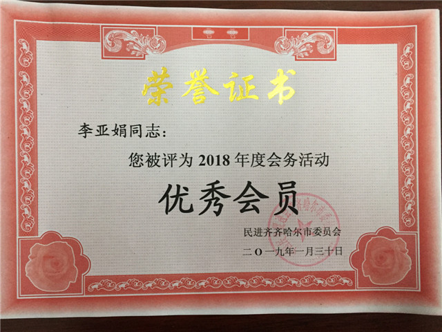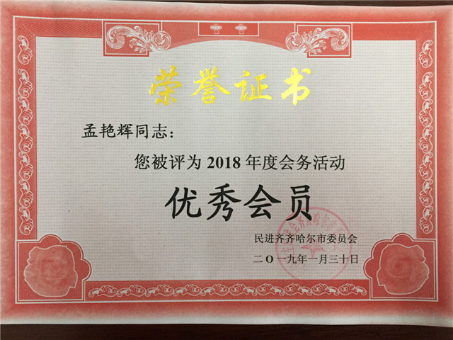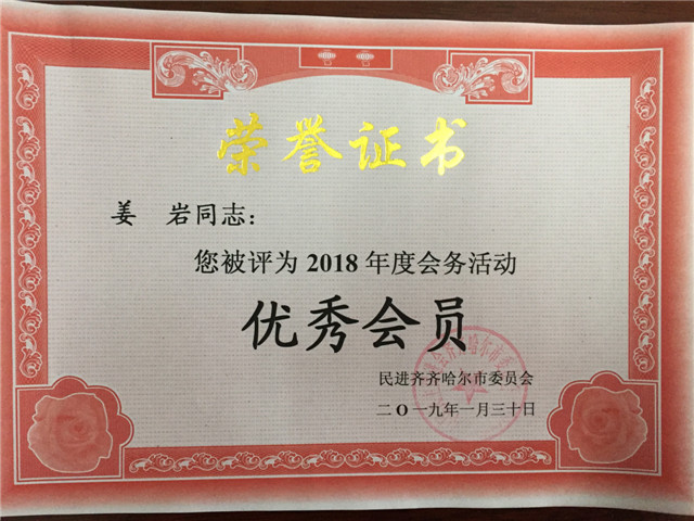 1月31日下午,在民进齐齐哈尔市委2018年度总结表彰大会上,民进Beat365中文官方网站支部被授予“先进集体”荣誉称号,姜岩、李亚娟、孟艳辉被授予“优秀会员”荣誉称号。