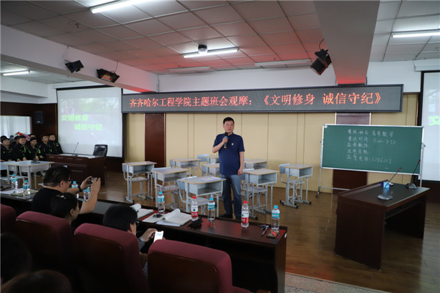 5月29日下午,学院2019文明修身主题班会观摩活动在图书馆501报告厅举行, 学院副院长张振笋、学生工作处处长贾宝栋、交通工程系主任张莹、团委书记周伟、各系学生工作副主任、全体辅导员和班主任老师与各班学生干部代表300人参加活动。