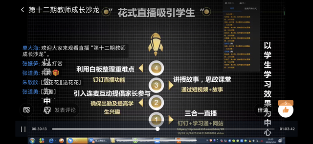 两位教师的交流分享结束后,参加此次活动的教师们在沙龙直播间与他们进行了交流互动。两位老师分别就“如何在线上教学过程中更好地对学生进行考核与评价”“如何记录和导出课堂数据”“课后任务如何考查”等问题,结合演示进行了答疑。