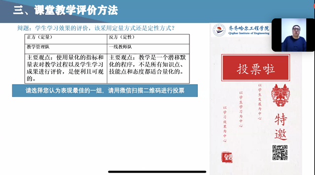 本次思享汇活动设计了丰富多元的互动形式。基础部副主任张洪岩连麦,对通识教育谈了自己的见解;信息工程系教学工作副主任刘春媛连麦,对专业教育矩阵谈了自己的观点——基于能力本位开发课程,每门课程要明确在专业当中的位置和作用;管理工程系教师吴庆娟连麦,就课程教学设计交流自己的认识——要结合课程四要素,探讨“以学生为中心”理论对课程建设的指导意义。王丹处长策划主持现场辩论活动,促进大家深度交流。围绕“对学生学习效果的评价,该采用定量方式还是定性方式”这一辩题,双方代表针锋相对,各抒己见,或认为:使用量化的指标和量表对教学以及学生学习成果进行评价,是便利且可观的;或认为:教学是一个潜移默化的过程,不是所有知识点、技能点和态度都适合量化。基于互动讨论,王丹处长进行了全面的总结。