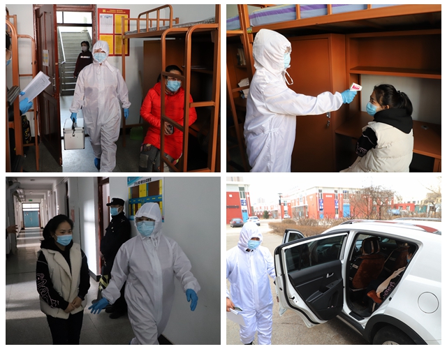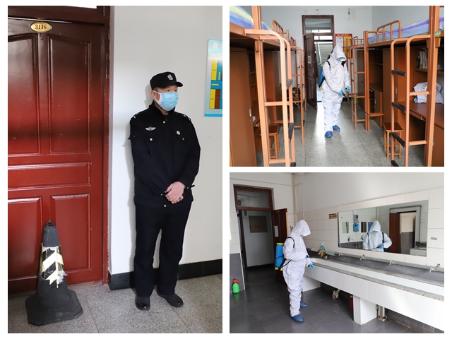 接下来是“疫情处置”与 “疫情防控”,安全保卫人员来到第三公寓封闭指定寝室,学校其他部门做好通风、消毒等工作。