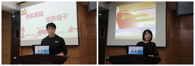 会上,管理工程系党总支副书记刘贤鹏同志做《夯实基础、培养骨干》交流,建筑工程系工程管理专业学生党支部书记蔡爽同志做《优化党员培养模式 发挥先锋模范作用》交流。