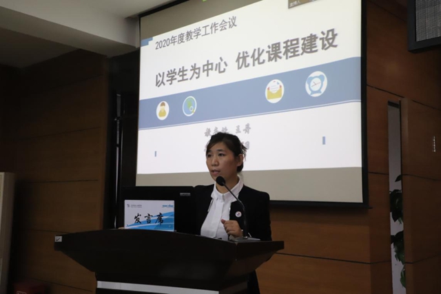 教务处处长王丹主持会议,并首先作题为《以学生为中心 优化课程建设》的教学工作报告,系统总结了上半年在线教学、第三学期教学工作取得的成绩,分别从加强课程思政建设、推进学风建设、优化课程建设、做强实践教学、开展专项评估五个方面,对下半年教学重点工作做出规划部署。