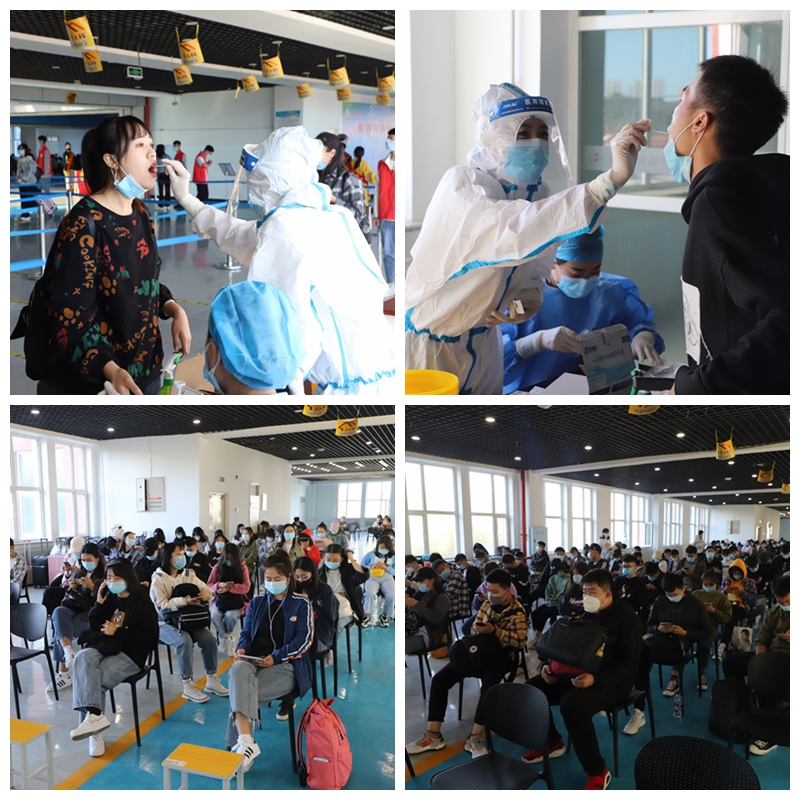 根据常态化疫情防控工作要求,学校秋季学期学生错峰返校期间,家长不可以陪同学生进入校园,但他们并不需要为此担心。首先,学校严格执行核酸检测流程,坚持做到“应检尽检,一人不落”。在科技园三楼报到现场,大厅里的大LED屏幕循环播放着“全国抗击新冠肺炎疫情表彰大会”和“学校疫情防控演练”的视频。各系返校学生在报到通道,有序用手机扫描并出示龙江健康码,经测量体温合格、核验身份无误后,领取检测卡与检测条码,来到紧邻的指定检测点出具核酸检测卡,上交检测条码。