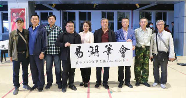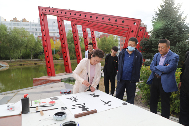 书法笔会现场选在易湖湖畔的红色梦蝶钢塑旁边,置身于天蓝水清、鸟语花香的校园美景之中,莅临笔会的书法家们心清气爽,下笔有神。