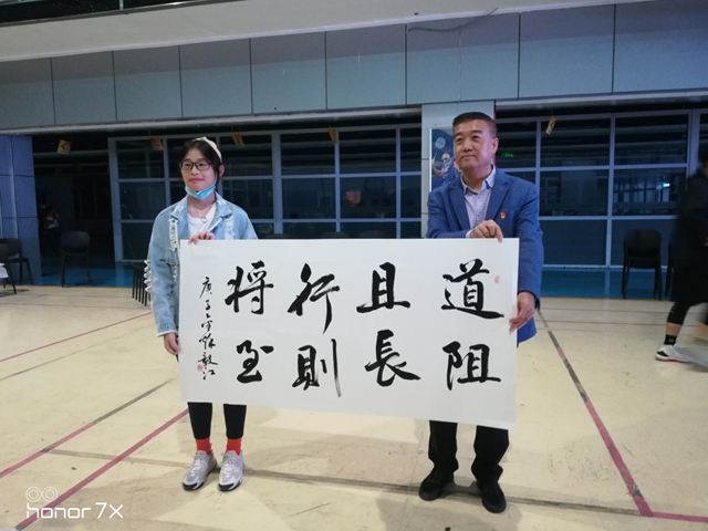 来自健康与护理系护理学专业185班的学生李欣月,本来是想站在王晓东先生桌旁欣赏其挥毫的场景,而王先生则亲切地问她需要什么字,可以现场写给她。李欣月欣然说就写“拼搏”,要挂在寝室内激励自己不断学习与成长。她得到这份赠与的墨宝后表示,中国文化博大精深,上下五千年的悠久历史,造就了伟大的中华民族!今天通过学校组织的讲座,她感觉到受益匪浅,自己有幸得到了晓东老师给予的一幅字,感到非常荣幸,如果将来有机会一定要好好去研究一下书法文化的博大精深。