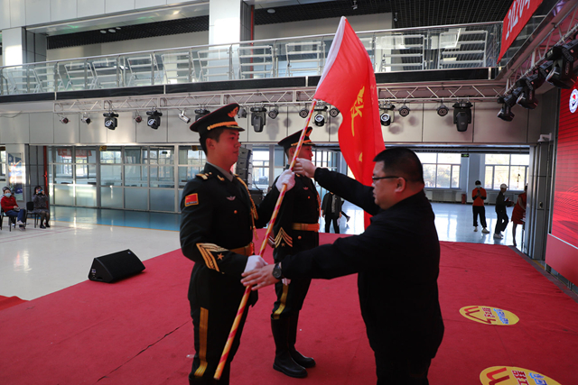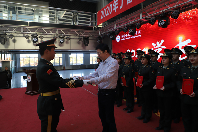 副院长张振笋、学生工作处负责人刘贤鹏为学长教官团授予团旗并颁发聘书。