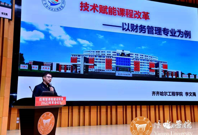 在12日下午专家报告中,李文禹老师做《技术赋能课程改革》报告,以财务管理专业为例,从课程四要素角度阐述技术赋能,分享课程开发搭建智慧平台的思考与实践。