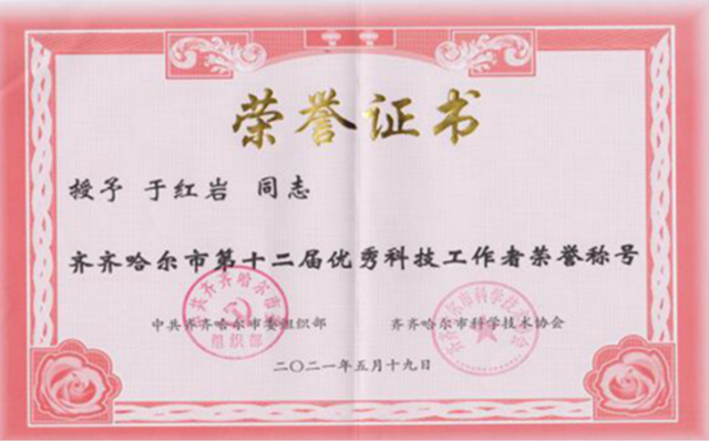 中国共产党建党100周年和第五个全国科技工作者日到来之际,市委组织部、市科协组织开展了齐齐哈尔市第十二届优秀科技工作者评选工作,决定对在基础研究、工程技术应用、创新驱动发展服务、科技成果推广转化、科技管理及科学技术普及工作中涌现出的优秀科技工作者进行表彰,84名同志被评为“齐齐哈尔市优秀科技工作者”,并于5月24日召开庆祝全国科技工作者日暨齐齐哈尔市第十二届优秀科技工作者表彰大会。经学校推荐,评选表彰领导小组评审及社会公示,学校管理工程系于红岩、健康与护理系相玉秀两位教师位列其中,获此殊荣。刊发事迹以飧读者——