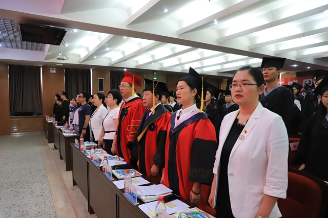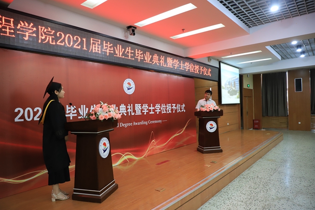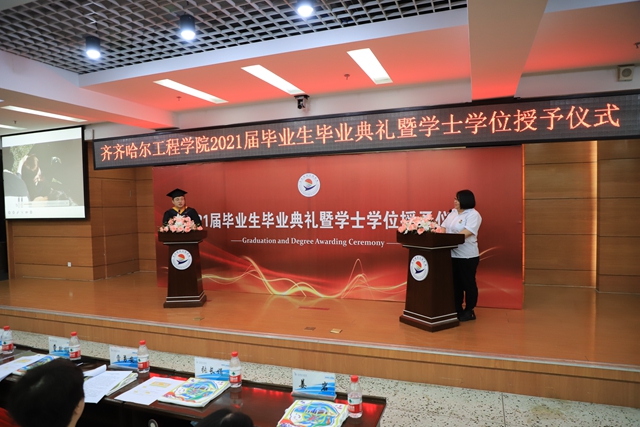 毕业生代表在《加冕进行曲》中依次走上主席台,由理事长曹勇安教授逐一为获得学士学位的毕业生扶正流苏,院长曹然彬为他们正衣冠,学校学术委员会主席、副院长蒋春艳为他们颁发学位证书。