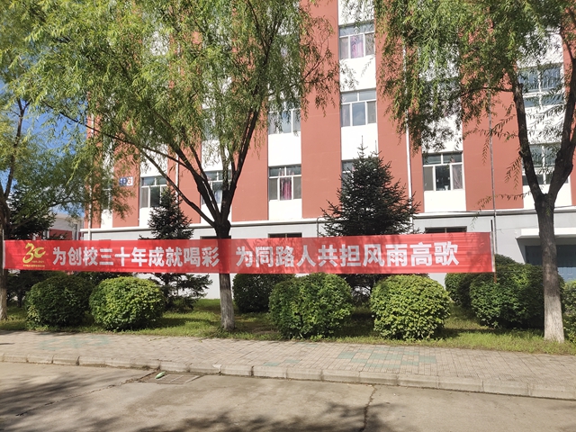 明德广场披上了节日盛装,门前台阶铺满了喜庆的红色,校徽和校名赫然醒目,简洁的年代标志,穿越了历史隧道,向人们昭示着30年的奋斗历程。