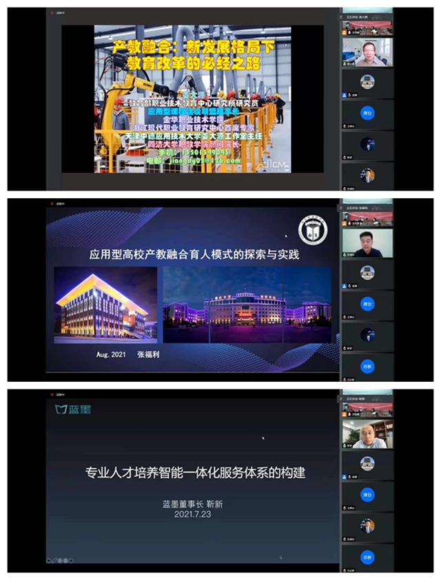 蓝墨科技董事长靳新作题为《专业人才培养智能一体化服务体系的构建》专题报告,报告介绍了高等教育如何应对产业人才需求变化带来的挑战,又从如何迎接产业人才需求的挑战,探讨如何培养出符合产业发展需求的未来数字化人才,如何真正促进产教融合,围绕专业人才培养智能一体化服务体系构建,报告分享了系列科技产品,并提出了具体建议。