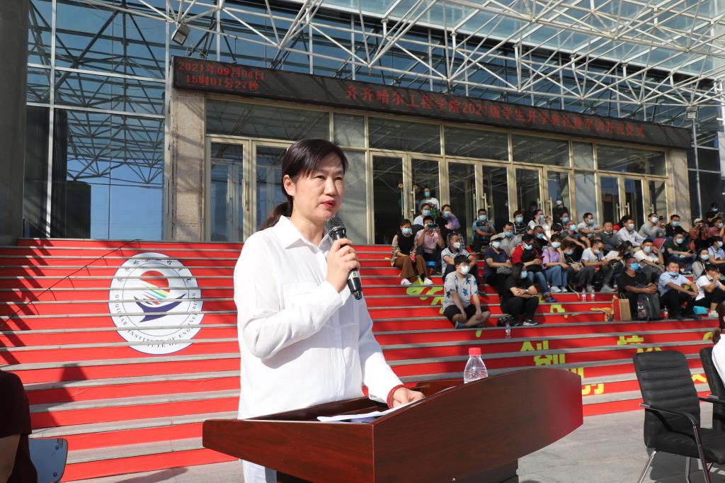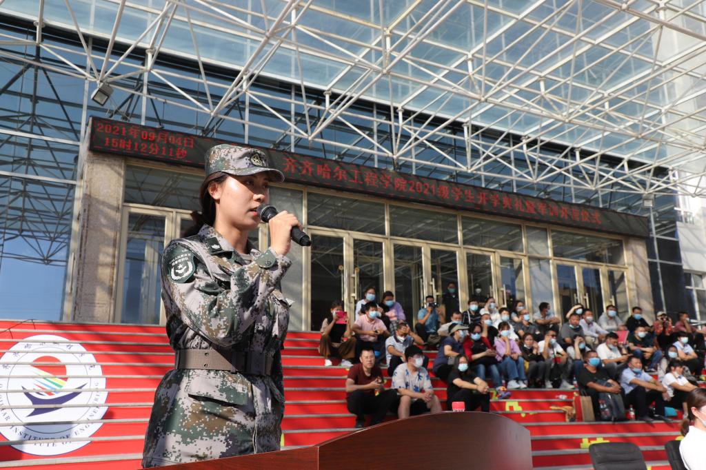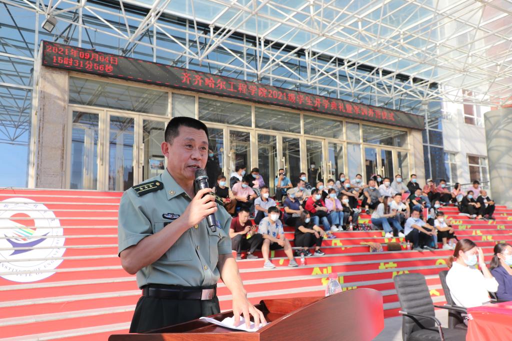 龙沙区武装部政委讲话,指出军训的目的,除了练技术,练体力,提高军事素质外,更重要的是增强组织纪律性,锻炼坚强意志,树立献身精神,培养良好的军人作风,以及军人那种坚忍不拔的毅力和迎着困难勇往直前的拼搏精神。相信同学们面对紧张、严格的训练,能够树立勇于磨练、敢于摔打的信心和勇气,顺利地过好艰苦关、紧张关,以实际行动交出一份合格的答卷。