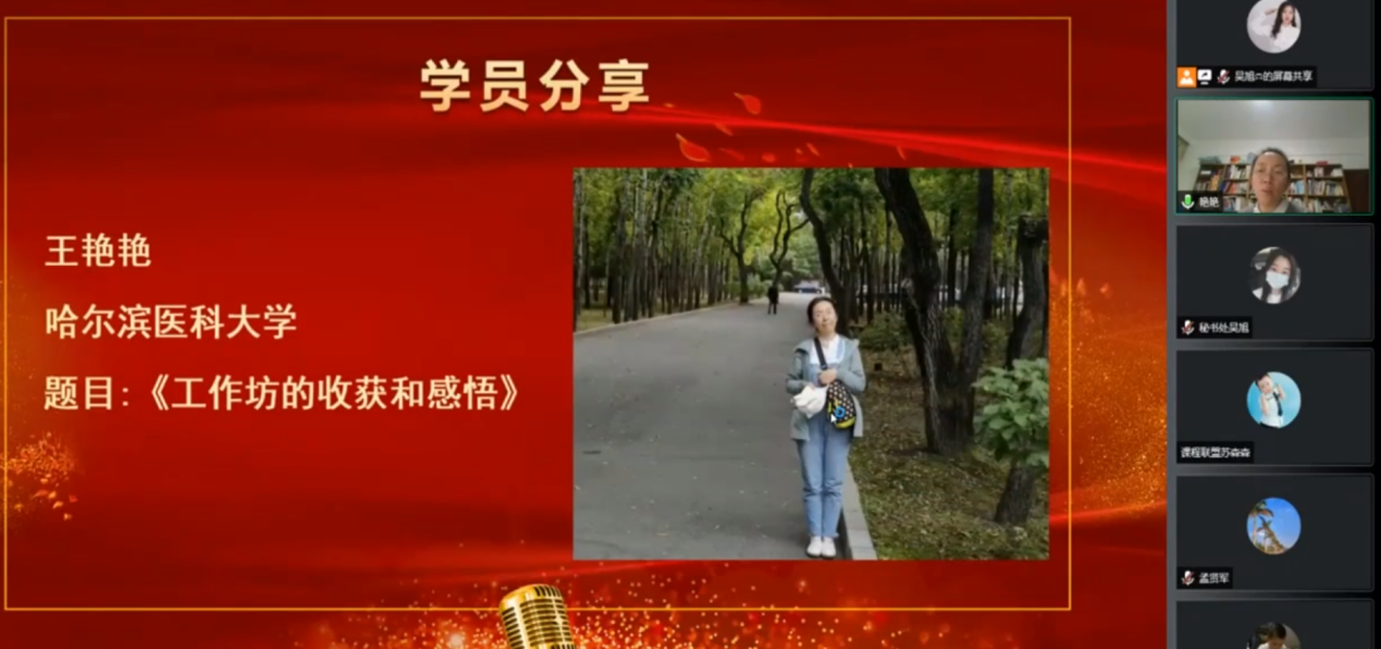 哈尔滨医科大学王艳艳分享了三级矩阵的编制过程,认识到人才培养目标确定、三级矩阵的编制整个闭环。王老师也提出通过培训改变了其从教材出发的教学理念,重新认识每一级教学目标的达成都需要课点的严格支撑,指出,工作坊的授课方式新颖、时间紧凑,为日常教学工作提供借鉴,培训中时时刻刻把以学生中心的理念落到实处。