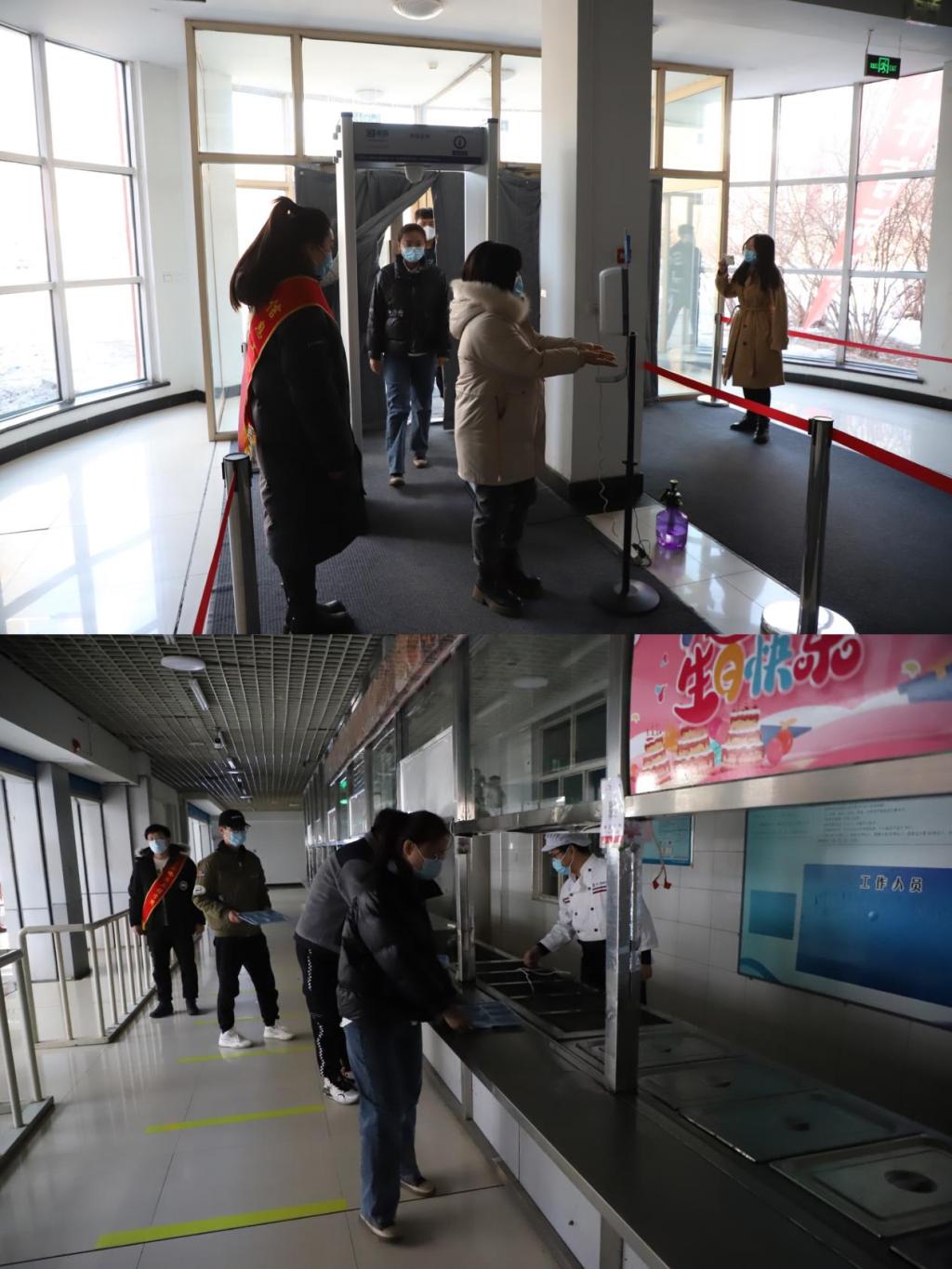 在学校的三味餐厅1楼,信息系辅导员扮演“志愿者”和“返校学生”,现场模拟学生进入食堂就餐、测温门测温、手消、领取餐盘、排队打饭和进入超市,排队间隔缴费等情景。