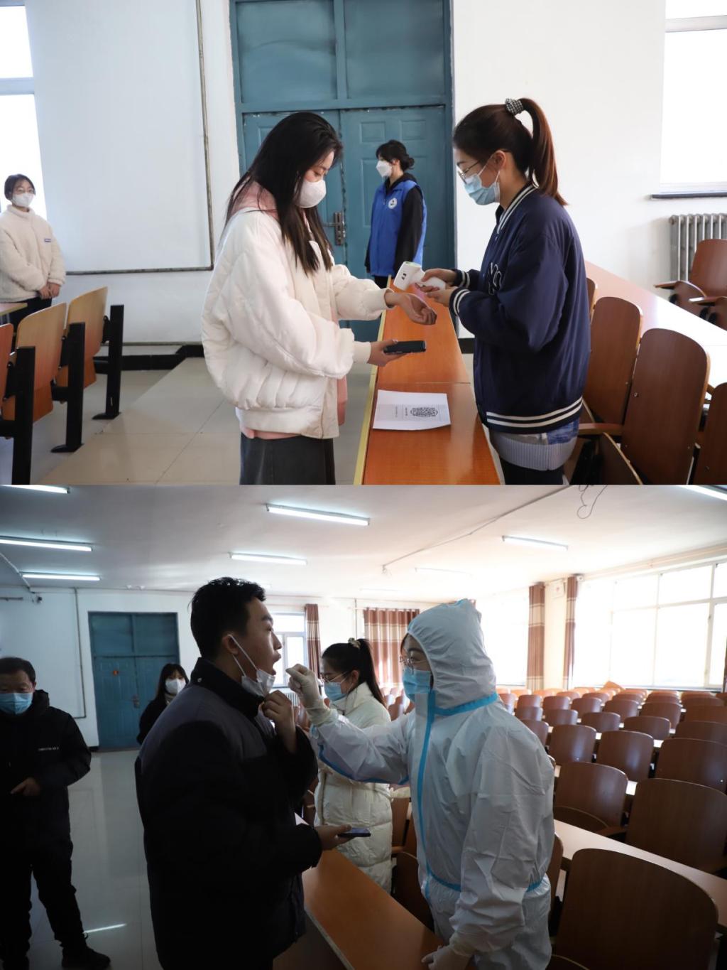 返校学生沿着通道进入核酸检测场所1号教学区1101室,护理系辅导员扮演“体温检测人员”和“核酸检测人员”对返校的学生进行测温、核酸检测。