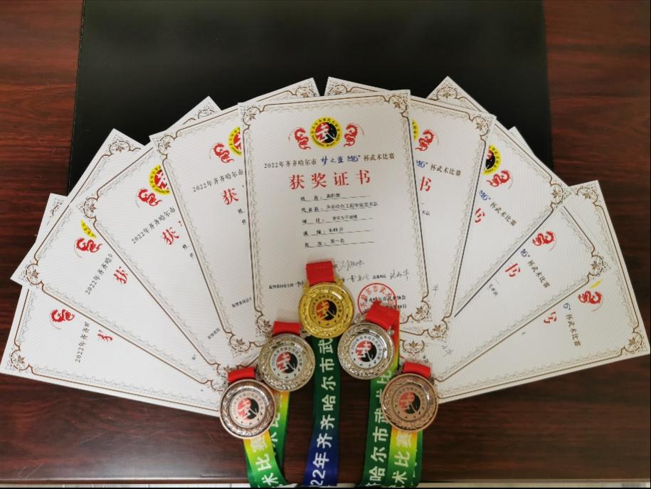 6月18日,由齐齐哈尔市武术协会主办的2022年齐齐哈尔市“梦之蓝M6+”杯武术比赛在市冬季运动项目中心速滑馆举行。来自全市武术联合会、县(市)区武术协会、各行业武术团体及民间武术馆、俱乐部的36支代表队约600名运动员参加,Beat365基础部体育教研室韩淑梅、周长满老师指导的护理213 谢阳妮、机械203 赵阳、健管202 刘举源、电商211王城灿四名学生组成的武术队,经过激烈的比拼,取得了一枚金牌、两枚银牌、两枚铜牌,以及一二三等奖的佳绩。