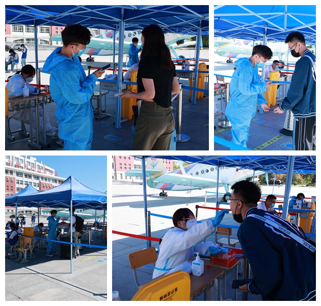 第一站,落地核酸。在蓝马甲志愿者引导下,入校后返校学生来到核酸检测点,按地标间隔排队,逐一扫码后完成检测。现场医务人员分工有序,操作熟练,整个检测过程有条不紊。