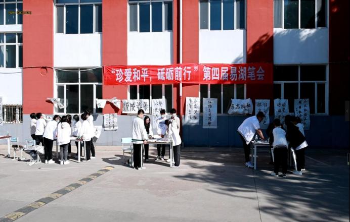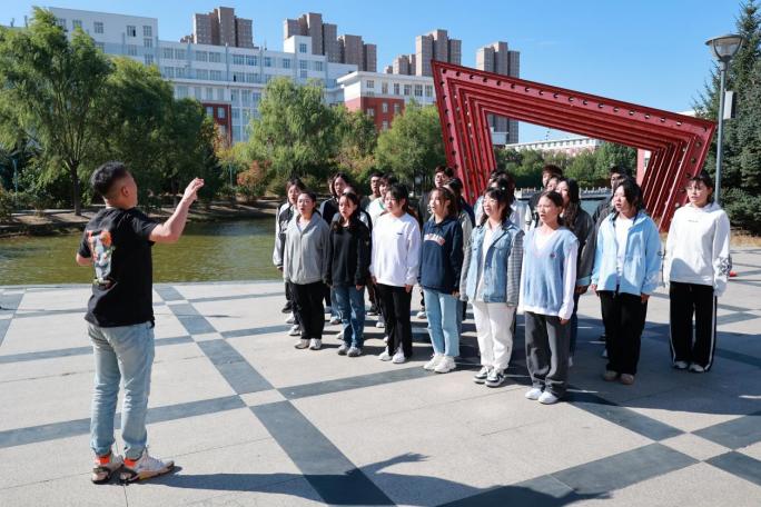 在学校易湖梦蝶广场,新生艺术团同学们组织了主题红歌会,在团委梁佟心老师的指导下,以嘹亮的歌声表达对祖国深深的热爱和美好的祝福。不远处“珍惜和平、砥砺奋进”易湖笔会主题活动正在进行,副院长张振笋、戴凤彬等老师与书法爱好者协会同学们现场挥毫,以书画形式表达爱国之情。