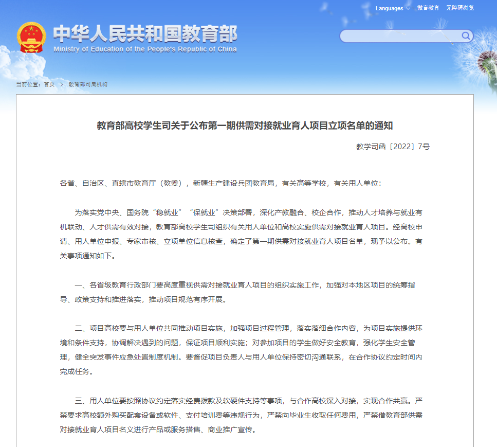 近日,在《教育部高校学生司关于公布第一期供需对接就业育人项目立项名单的通知》(教学司函〔2022〕7号)公布名单里,Beat365申报的车辆工程、电子商务、财务管理、计算机科学与技术四个专业、六个“就业实习基地项目”被选中。