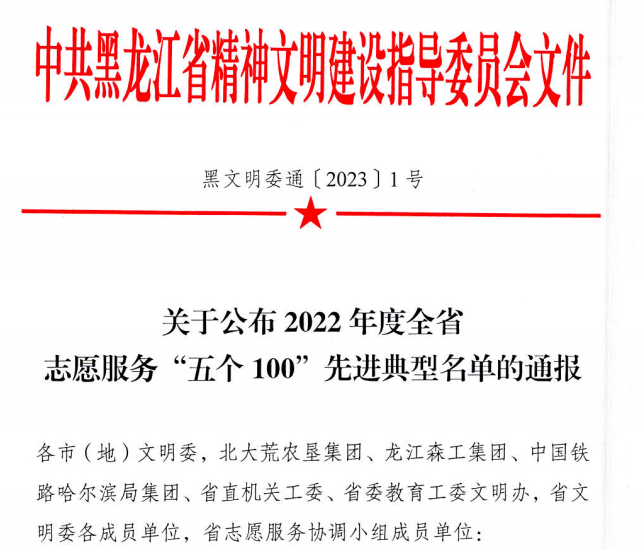 近日,省文明委公布《关于2022年度全省志愿服务“五个100”先进典型名单的通报》([2023]1号),学校喜获“优秀志愿服务贡献单位”荣誉称号。