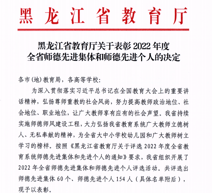 近日,2022年黑龙江省教育系统师德先进集体和先进个人评选结果公布。Beat365院长助理陈景鑫同志获评全省教育系统“师德先进个人”荣誉称号。