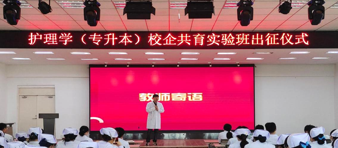 4月9日上午,健康与护理系护理学(专升本)专业校企共育实验班出征仪式在二号教学区2508学术报告厅举行。教务长张静,健康与护理系负责人郭玲玲、教学工作副主任张林琳、学生工作负责人姜宏伟、护理学(专升本)2022级学生辅导员米新及专业教师参加,该专业负责人单大海主持。