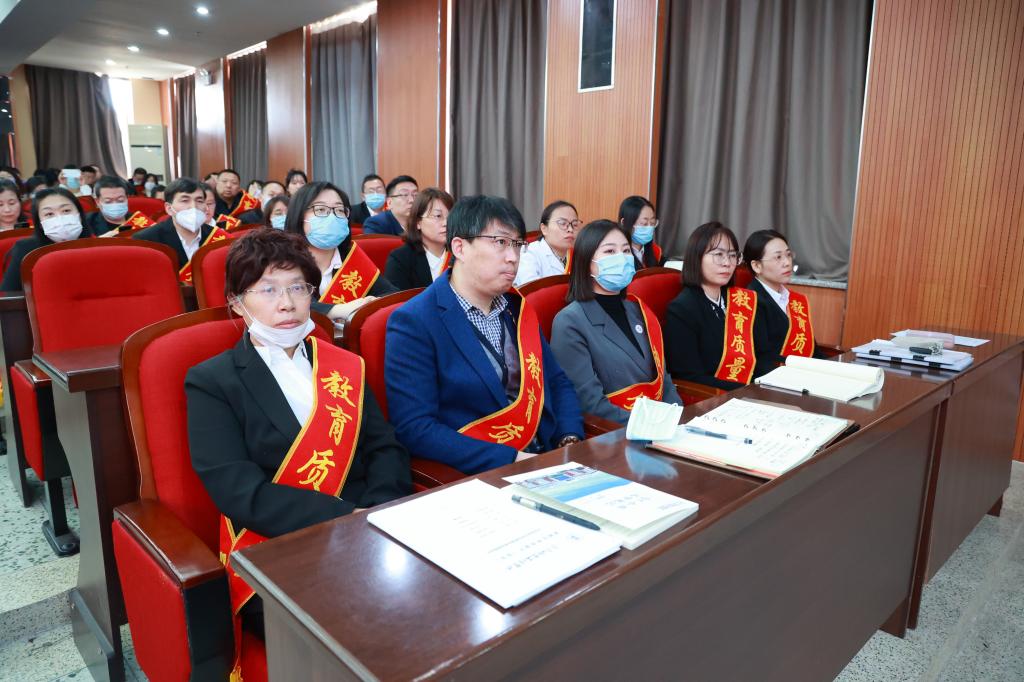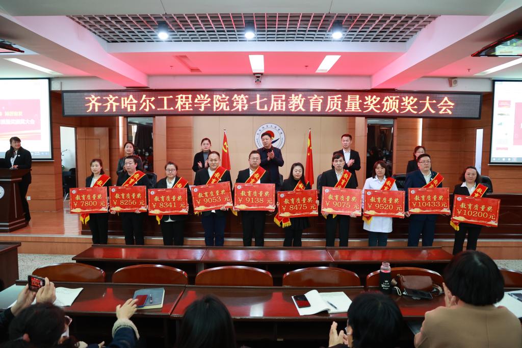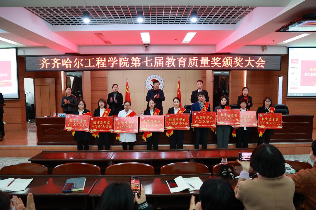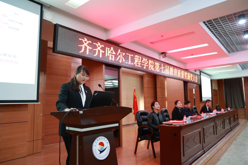4月24日下午,学校在图书馆601报告厅召开第七届教育质量奖颁奖大会,理事长曹勇安、党委书记郭伟东、副院长白雪、教务长张静、院长助理陈景鑫出席会议,全面质量管理办公室主任孟艳辉主持,全体教职工参加。