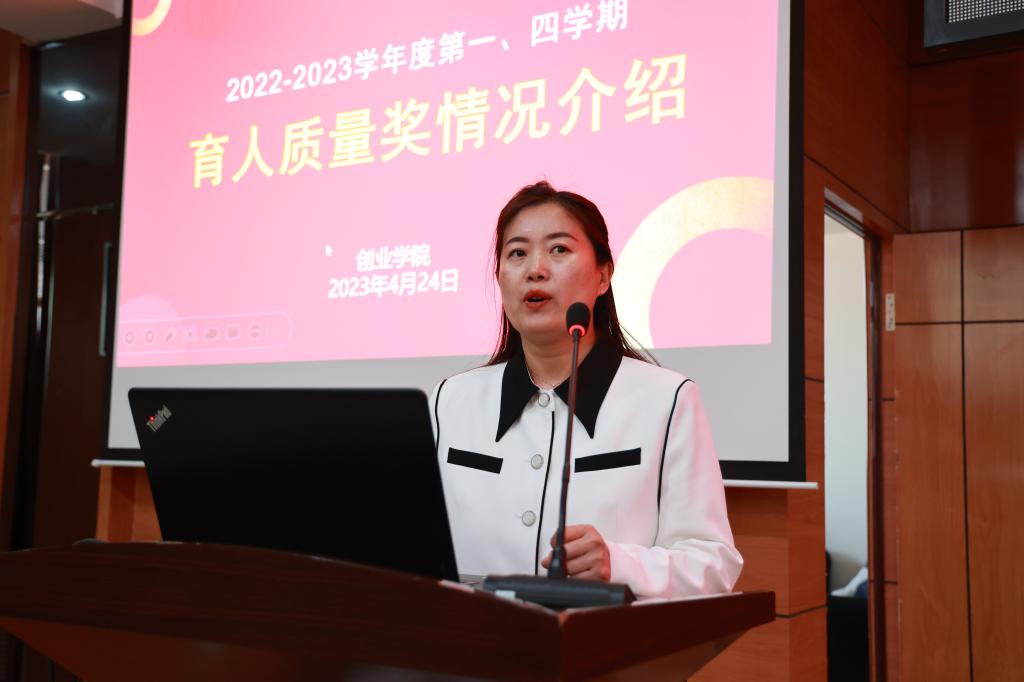 创业学院副院长康静作育人质量奖评选情况汇报。详细说明了奖励原则、考核对象、参评条件等,介绍了育人质量奖评价档级系数及奖励情况。通过数据对比展现工作成效,并指出下一步工作方向:生涯导师练“五功”增强业务素质;生涯导师多元,增加师生互选环节;生涯导师考核将从“常规工作”和“重点工作”维度着手;注重过程性材料积累留痕,为申报教学成果奖做准备。