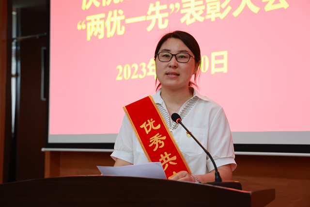 管理工程系王文晶同志代表受表彰集体和个人发言。她表示,从庄严地举起右手宣誓的那一刻开始,心里便多了一份神圣的承诺,肩上便多了一份光荣的责任。在今后的工作中,将继续努力,争先创优。为学校教育事业发展做出更大贡献。