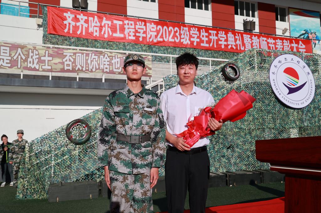 学生代表为单大海老师献上鲜花,表达全体学生对教师节日的祝福与感恩。单大海老师为新生代表佩戴校徽,体现文化传承,精神传递。