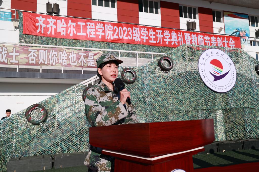 信息工程系计科232班蔡依琳同学代表新生发言,表示通过此次军训活动,身心得到了锻炼,增进了同学之间的感情,要把爱国热血融入学习、生活之中,铸就无悔青春,向时代交出一份合格的答卷。
