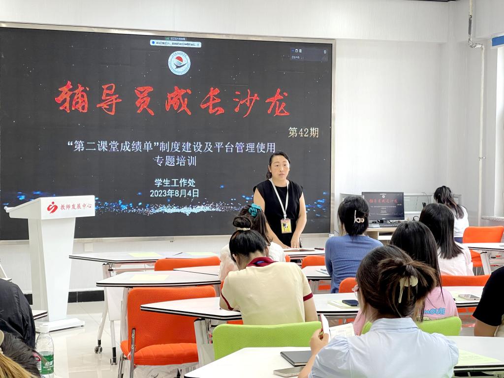 8月4日上午,学校第42期辅导员成长沙龙在二号教学区2102会议室举行。校团委王睿老师为大家讲解“第二课堂成绩单”制度建设并对平台管理使用进行专题培训。培训以线上线下的方式进行,43人参加。