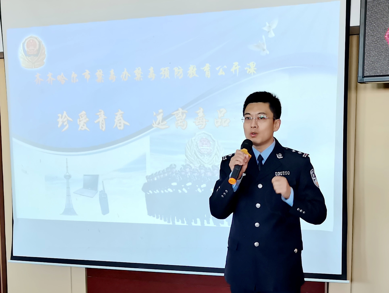 11月3日下午,学校团委于图书馆501报告厅开展“健康人生、绿色无毒——禁毒预防教育公开课”。本次活动特邀齐齐哈尔市公安局禁毒支队大队长于振东为学校学生开展讲座。活动通过到梦空间报名参与,共计300名同学参加。