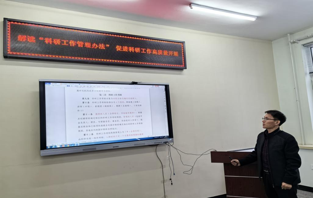 为营造部门浓厚的学术文化氛围,更好地提升教师的科研能力和学习水平,11月16日下午,马克思主义学院、基础部在三号教学区1211会议室开展了“解读科研管理办法,促进科研工作高质量发展”为主题的科研专题学习研讨活动,科研处宋庆永老师进行专门专题指导,马克思主义学院教师和基础部教师参加了本次学习,马克思主义学院教学副院长李娜主持本次活动。