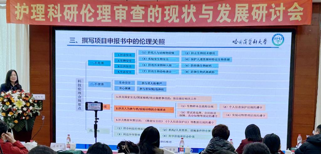尹梅教授结合实际案例,生动幽默地解读了《医学伦理难题与科研伦理审查现状》,阐述了如何在科学性和伦理性间找到平衡,让科学技术在伦理框架下有序健康地发展,为科学研究保驾护航。