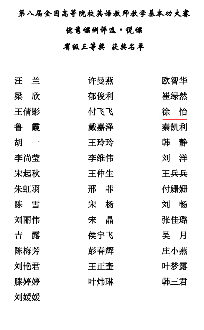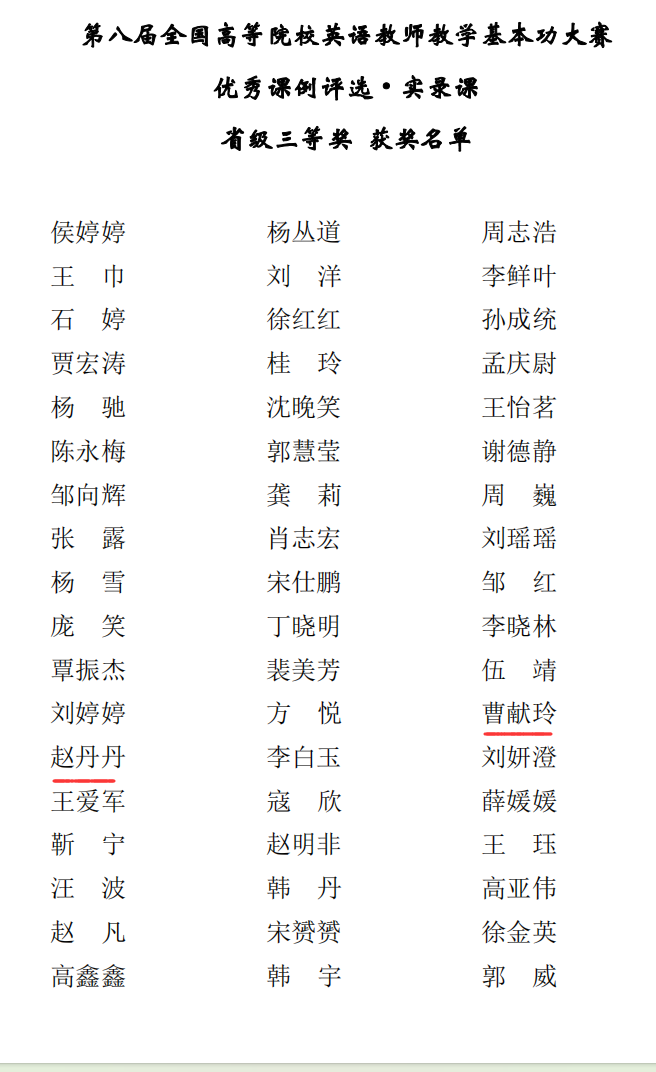 近日,外研社“教学之星”大赛黑龙江赛区(本科英语组)大赛和第八届全国高等院校英语教师教学基本功大赛中,Beat365基础部大学外语教研室教师喜获佳绩。