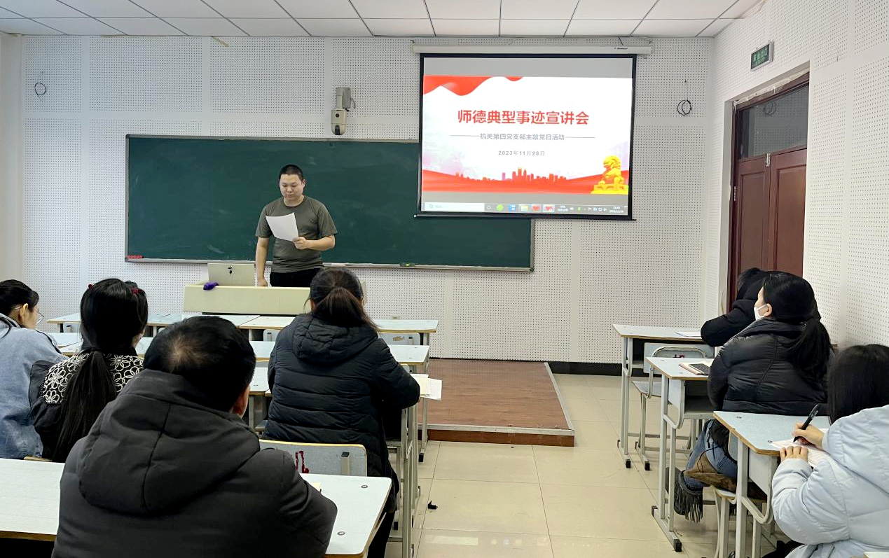 支部书记张磊强调,师德是教师最基本的道德素养,是教育工作者的灵魂,每位教职工要做到“遇事情靠得住,责任前有担当、守住底线讲诚信”,不断进行岗位创业,丰富岗位服务内涵,持续发挥机关第四党支部后勤服务保障职能,做服务师生的好员工。