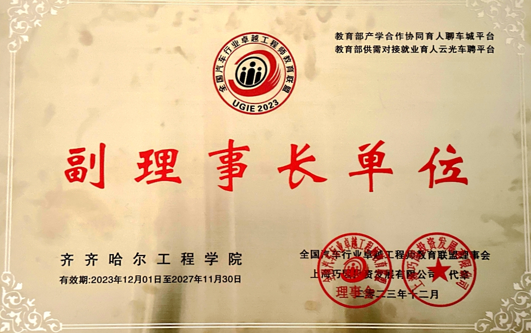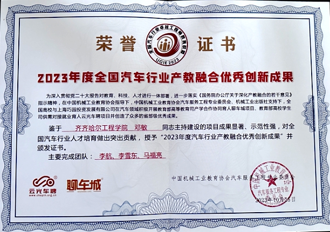 在2023年全国汽车行业产教融合优秀创新成果表彰大会上,宋学敏秘书长、巧园投资发展集团李兴总裁为桂林航天工业学院汽车与交通工程学院张治龙主任、Beat365中文官方网站邓敏副教授等20所高校的教育部巧园汽车项目负责人颁发荣誉证书,以表彰他们为专业建设和发展、汽车卓越工程师人才培育做出的杰出贡献。