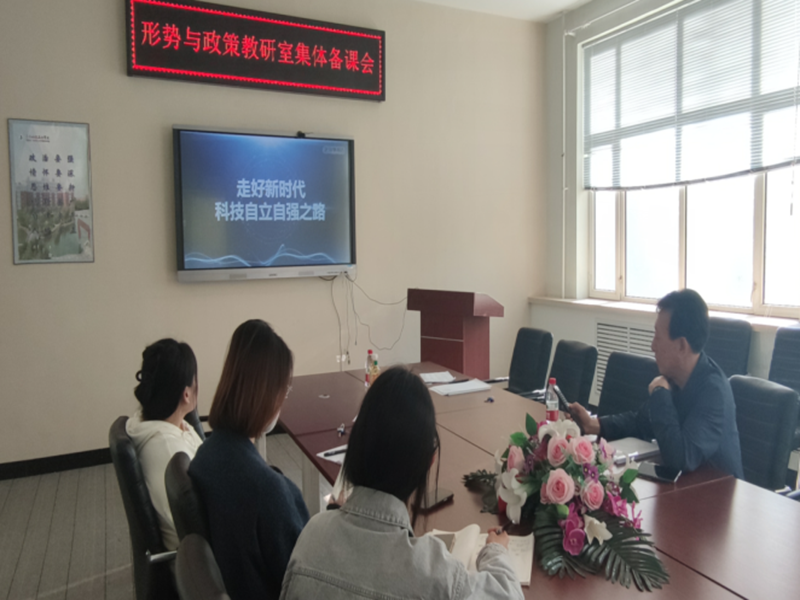 5月6日,王树松教授带领教师认真学习研读了本学期形策课中“走好新时代科技自立自强之路”“铸牢中华民族共同体意识”两个专题,并明确了两个专题的教学目标、教学重难点。任课教师对两个专题的内容、课程设计、教学流程、教学重难点有了更全面、更深入的认识和掌握。王树松教授根据自身经验,分享了具体教学中的备课思路和教学设计等。与会教师积极参与讨论与交流。